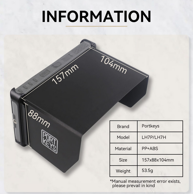 Die Portkeys LH7P/LH7H Sonnenblende ist eine leichte, faltbare Monitorhaube, die den LH7P und LH7H 7-Zoll-Feldmonitor vor Blendung und Sonnenlicht schützt und so eine klare Sichtbarkeit bei Außenaufnahmen gewährleistet. Er besteht aus strapazierfähigem PP+ABS-Material, wiegt nur 53,5 g und verfügt über ein kompaktes Design mit den Maßen 157 × 88 × 104 mm, das sich einfach anbringen lässt und sicher sitzt. Die mitgelieferte stoßfeste Gummihülle bietet zusätzlichen Schutz beim Transport.