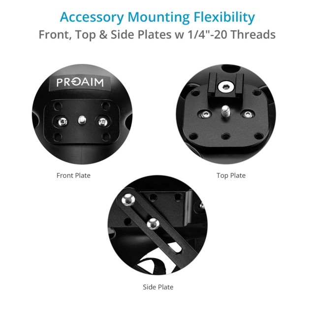 Außerdem verfügt er über Befestigungsplatten an der Vorderseite, Oberseite und den Seiten mit mehreren 1/4"-20-Gewinden, um verschiedene Optionen für die Befestigung von Kameras, externen Stromversorgungen und anderem Zubehör wie kleinen Videoleuchten oder Mikrofonen zu unterstützen.