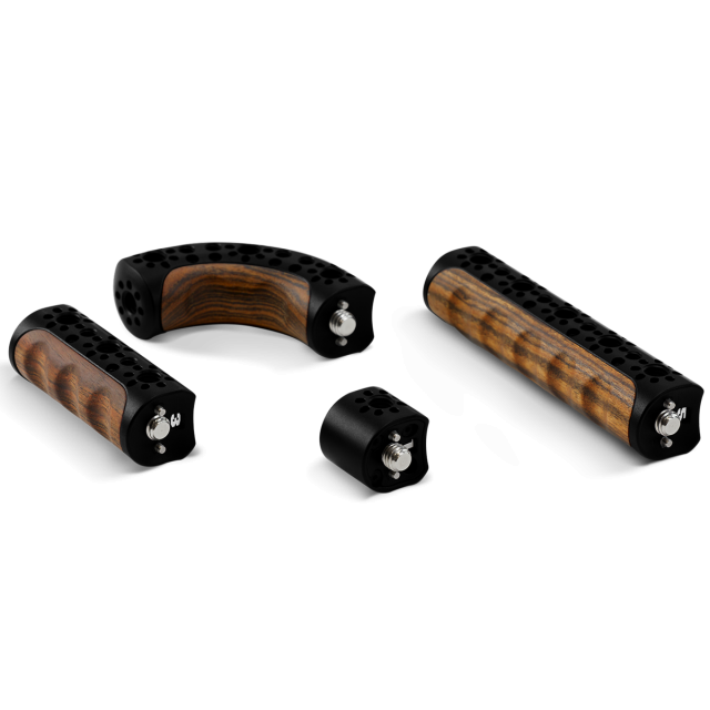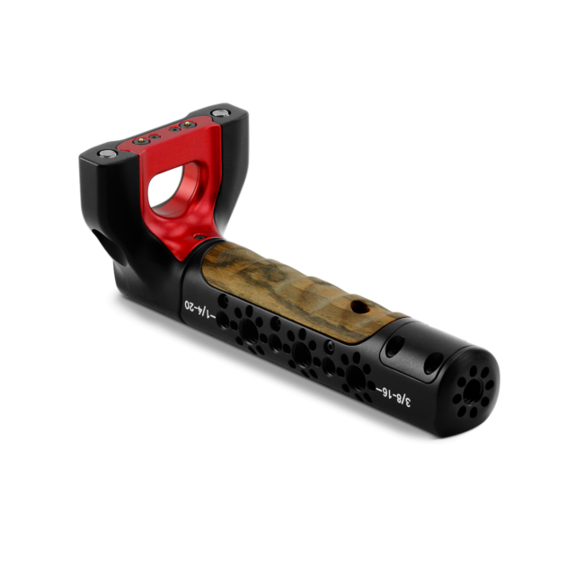 Der V-RAPTOR™ Top Handle verfügt über eine spezielle Start/Stopp-Taste, ergonomische Bocote-Holzeinlagen und mehrere 3/8-16 und 1/4-20 Befestigungspunkte. Zusätzlich sind 1", 3" und 5" Verlängerungsstücke für den oberen Handgriff, ein Winkelstück und eine 15-mm-Monitorhalterung enthalten.