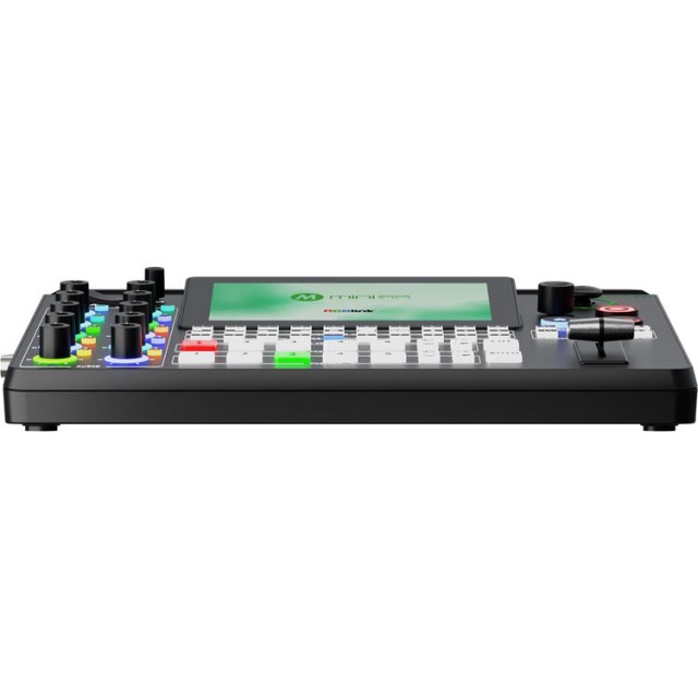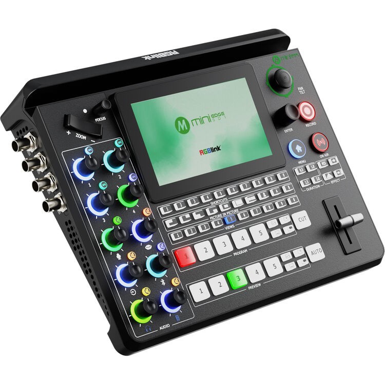 Der Mini-Edge SDI verfügt über ein integriertes 5,5-Zoll-HD-Farbdisplay für die Echtzeitüberwachung von Eingängen, Vorschau und Programmausgängen. Seine taktile Bedienoberfläche umfasst beleuchtete Tasten, Drehregler, einen Joystick und einen T-Bar-Fader für schnelles und präzises Umschalten. Die integrierte PTZ-Steuerung über VISCA und NDI|HX3 ermöglicht die direkte Steuerung von Schwenk, Neigung, Zoom und Fokus von bis zu vier Kameras direkt vom Switcher aus, mit Joystick-Bedienung und Abruf von Voreinstellungen.