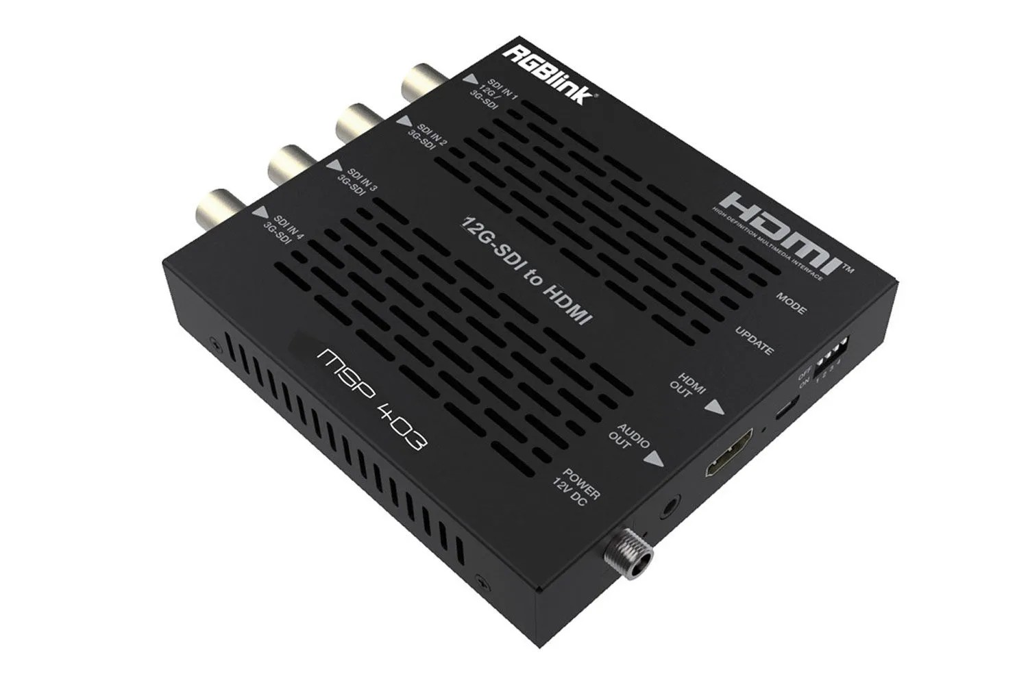 Der RGBlink MSP 403 ist ein professioneller 4K-12G-SDI-zu-HDMI-Konverter, der für hochwertige Videoüberwachung und Signalumwandlung in Broadcast- und Live-Produktionsumgebungen entwickelt wurde. Der MSP 403 unterstützt Single-Link-12G-SDI- oder Quad-Link-3G-SDI-Eingänge mit HDMI 2.0b-Ausgang und bietet zuverlässige Langstreckenübertragung, Audio-Einbettung und ultrahochauflösende Ausgabe mit bis zu 2160p bei 60 Hz.