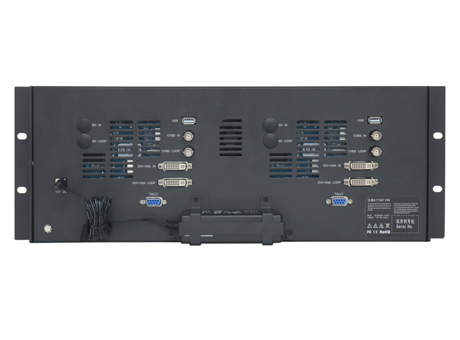 Jedes Display unterstützt eine Vielzahl von Videoeingängen, darunter 3G/HD/SD-SDI, DVI, VGA und Composite (CVBS), mit Durchschleifausgängen an jedem Eingang für eine nahtlose Signalverteilung. Der Monitor unterstützt die automatische Erkennung des Eingangsstandards, die Umschaltung zwischen Underscan und Overscan sowie eine einstellbare Blickwinkelstruktur für optimale Sichtbarkeit in Rack-Umgebungen. Eingebettetes Audio von SDI- und HDMI-Quellen kann über einen 3,5-mm-Kopfhörerausgang überwacht werden. Mit seinem robusten Rack-Design, dem effizienten 12-V-Gleichstrombetrieb und der Unterstützung für Tally-Steuerung über D-SUB15 ist der RMS8424S eine zuverlässige und vielseitige Überwachungslösung für professionelle Broadcast- und AV-Workflows.