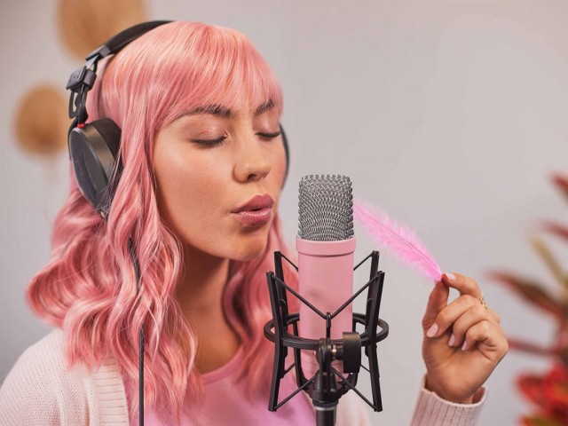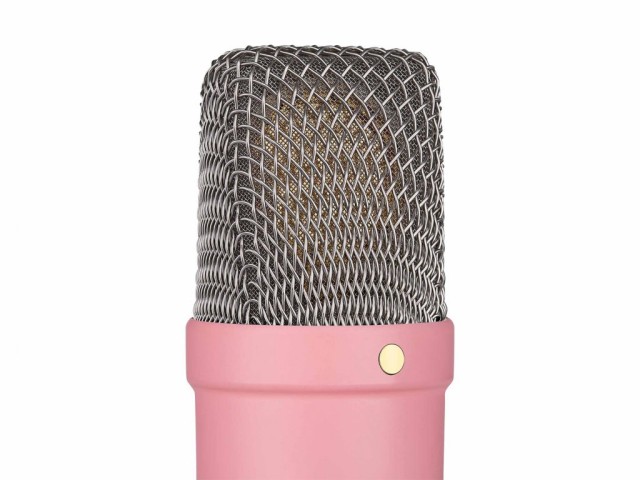 velkomembránový studiový kondenzátorový mikrofon, 1“ membrána, XLR(m) konektor, vysoká dynamika a akustický tlak SPL, protiotřesový koš s pop filtrem, mikrofonní kabel, bytelné tělo mikrofonu, barva růžová