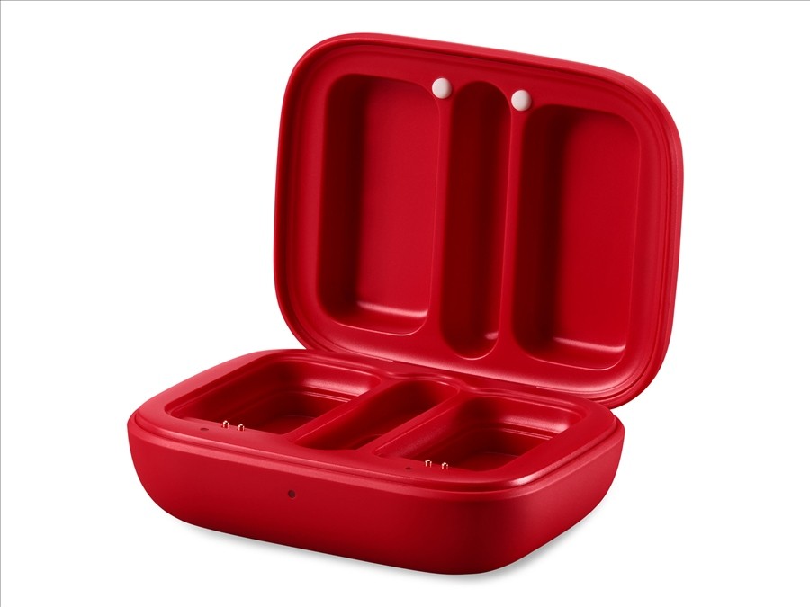 ist eine schützende Transporttasche für beide Sender und den Empfänger. Gleichzeitig dient sie als Ladestation, die während des Transports oder der Drehpause für das Aufladen der Sender sorgt. Sie kann über das mitgelieferte USB-C-Kabel mit Strom versorgt werden, oder Sie können zum Aufladen den internen Akku verwenden, der alle Komponenten des Sets zweimal vollständig aufladen kann.