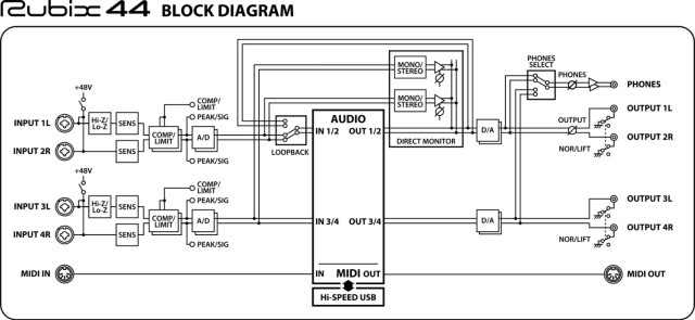 Hochdynamische Quellen wie Perkussionsinstrumente benötigen oft eine Pegelanpassung durch Dynamikbearbeitung. Es ist auch üblich, Gesang und Bass während der Aufnahme zu komprimieren, um die Pegel auszugleichen und diese Quellen einfacher zu mischen. Der Rubix44 ist mit über das Bedienfeld zugänglichen Kompressoren/Limitern an den Eingängen 1/2 und 3/4 ausgestattet, die für gute, heiße Signale ohne Clipping und unerwünschte Verzerrungen sorgen. Die Dynamikverarbeitung ist vollständig analog und bietet eine reibungslose und transparente Steuerung ohne zusätzliche Latenz.