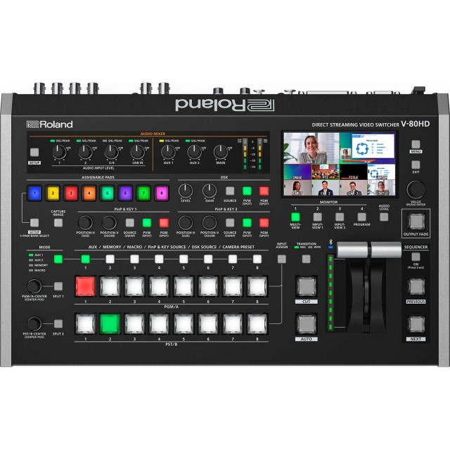 Acht vom Benutzer zuweisbare Pads ermöglichen eine schnelle Kontrolle über die vielen Funktionen des V-80HD. Die Pads sind in acht Bänken organisiert und bieten direkten Zugriff auf 64 verschiedene Funktionen. Rufen Sie Szenen, Makros und Sequenzerschritte auf, triggern Sie Audio- und Videoclips, starten/stoppen Sie Streams und mehr. Es ist sogar möglich, Funktionen in der Graphics Presenter Software zu steuern, wenn der Host-Computer über USB mit dem V-80HD verbunden ist.
