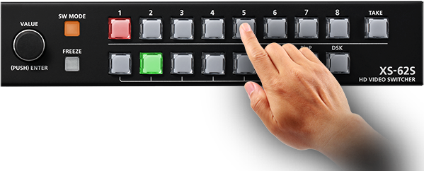 Der XS-62S Video-Switcher kann sechs Eingänge nahtlos umschalten, darunter 3G-SDI, HDMI und analoge Quellen (RGB, Component und Composite) sowie zwei im internen Speicher abgelegte Standbilder. Es können drei Videoumschaltmodi ausgewählt werden, so dass der XS-62S eine breite Palette von Anwendungen ermöglicht.