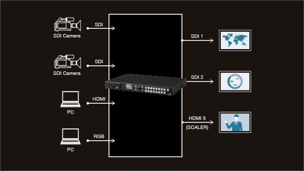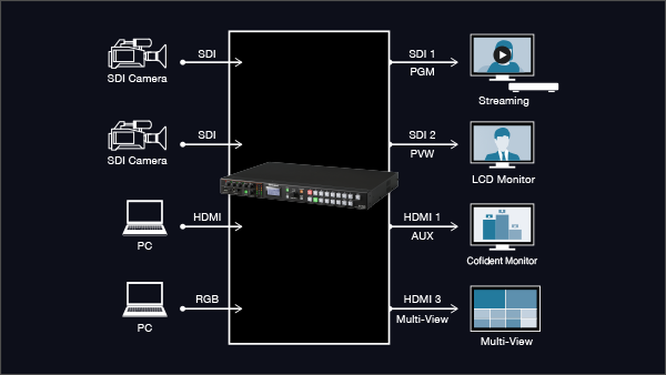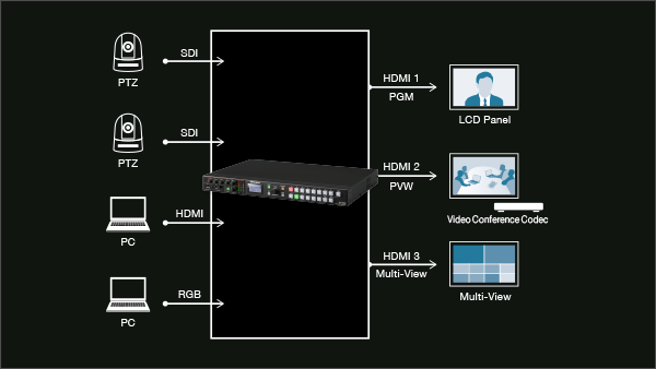 Der Matrix-Modus macht es einfach, verschiedene Inhalte von einem einzigen Mischer an zwei oder drei Bildschirme zu senden, während gleichzeitig Programmton gemischt und PTZ-Fernkameras gesteuert werden.