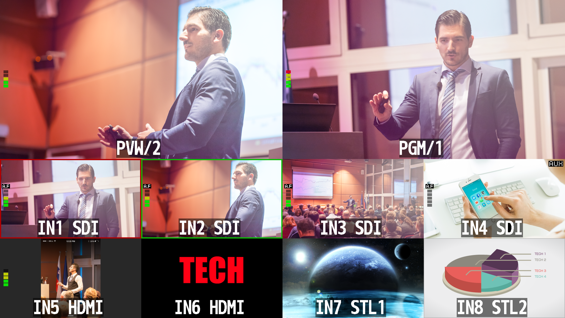 Das XS-62S kann alle sechs Videoeingänge, zwei Standbilder, PGM und PVW über den Multi-View-Ausgang auf einem einzigen Monitor anzeigen. Mit Multi-View kann auch das Menü angezeigt werden, so dass Sie Einstellungen vornehmen können, ohne den Fokus von der Vorschauanzeige zu ändern. Ab Version 2.5 ist der Austausch von PGM/PVW-Fenstern und die Bearbeitung von Eingangsbezeichnungen möglich.