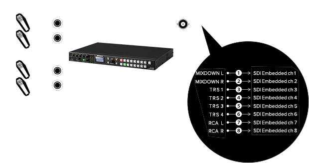 Binden Sie bis zu acht analoge Audioeingänge auf separaten Kanälen in die SDI 1- und 2-Ausgänge ein. Wählen Sie aus einer Vielzahl von Feeds - Pre-Effekt (trocken), Post-Effekt und Pre-Fader (nass) oder Post-Effekt und Post-Fader (nass) -, um Ihre Postproduktionsanforderungen nach dem Live-Event zu erfüllen. Diese Funktion ist auch für mehrsprachige Veranstaltungen nützlich, da Sie einen Voice-over oder eine Sprachübersetzung auf einem eigenen Audiokanal aufnehmen können.