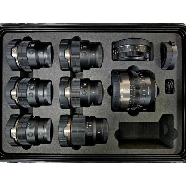 Sada všech šesti filmových AF objektivů řady Samyang V-AF a příslušenství v pevném přepravním kufru. Set obsahuje objektivy V-AF 20 mm T/1.9 FE, V-AF 24 mm T/1.9 FE, V-AF 35 mm T/1.9 FE, V-AF 45 mm T/1,9 FE, V-AF 75 mm T/1,9 FE a V-AF 100 mm T/2,3 FE, a také adaptéry V-AF Anamorphic MF Adapter 1.7x a V-AF MF Adapter.