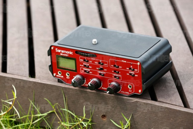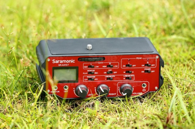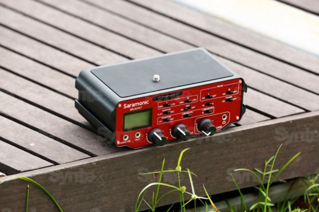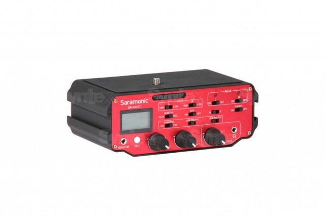 Das Topmodell der Saramonic SR-AX-Audiointerface-Serie für DSLR/DSLM-Kameras und Kleinkameras ist ein Zweikanal-Mischer mit aktiver Elektronik inklusive Phantomspeisung. Es verfügt über zwei symmetrische XLR-Eingänge, einen Gain-Schalter (0/20 dB) und eine 40-dB-Dämpfungszelle (MIC/LINE), umschaltbare 12V- oder 48V-Phantomspeisung, Pegelmessung (-18 - +3 dB in 3-dB-Schritten), Kopfhörerausgang mit manueller Lautstärkeregelung, Spitzenpegelanzeige für jeden Kanal, schalter für die Hörquelle (Eingang/Ausgang), AGC ON/OFF-Funktion zur Deaktivierung der automatischen Lautstärkeregelung bei Kameras, die über diese Funktion verfügen (in der OFF-Einstellung enthält der linke Kanal ein 20-kHz-Sinussignal, um den AGC-Effekt in leisen Passagen zu eliminieren), und einen Trenntransformator. Es wird mit einer 3/8"-Stativschraube an der Unterseite der Kamera befestigt, das gleiche Gewinde befindet sich an der Unterseite des Geräts, und an beiden Seiten befinden sich Blitzbuchsen zur Befestigung von zusätzlichem Zubehör. Das Gewicht beträgt 0,51 kg, die Abmessungen sind 15,2 x 9,5 x 4,4 cm; die Stromversorgung erfolgt über eine 9-V-Batterie.