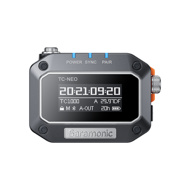 Der Saramonic TC-NEO ist ein hochpräziser drahtloser Timecode-Generator, der für eine einwandfreie Synchronisation bei Mehrkamera- und Außenaufnahmen entwickelt wurde. Sein hochpräziser TCXO bietet eine Genauigkeit von ±0,5 ppm und sorgt dafür, dass die Abweichung über einen Zeitraum von 48 Stunden auf weniger als ein Frame begrenzt bleibt – eine entscheidende Eigenschaft für lange Dreharbeiten. Das Gerät bietet flexible Synchronisationsmethoden für jede Konfiguration, darunter One-Tap-Synchronisation für bis zu 48 Geräte über die Saramonic System App (Bluetooth), direkte drahtlose Synchronisation zwischen Geräten (2,4 GHz) oder eine kabelgebundene Verbindung über den 3,5-mm-Timecode-Anschluss. Das hochauflösende 1,1-Zoll-OLED-Display ermöglicht eine klare Echtzeitüberwachung und wird über benutzerfreundliche Drehregler bedient. Jedes TC-NEO-Gerät wird von einem integrierten 1150-mAh-Lithium-Polymer-Akku mit einer Betriebsdauer von bis zu 22 Stunden im Dauerbetrieb gespeist. Für Setups mit mehreren Geräten kann das mitgelieferte Ladekit drei Geräte aufnehmen und mit Strom versorgen, sodass den ganzen Tag über Strom zur Verfügung steht und der Arbeitsablauf durch die Aktivierung des Uhrmodus mit einem Tastendruck vereinfacht wird. Damit ist das TC-NEO ideal für jede Produktion, von Dokumentarfilmen bis hin zu Kinofilmen.