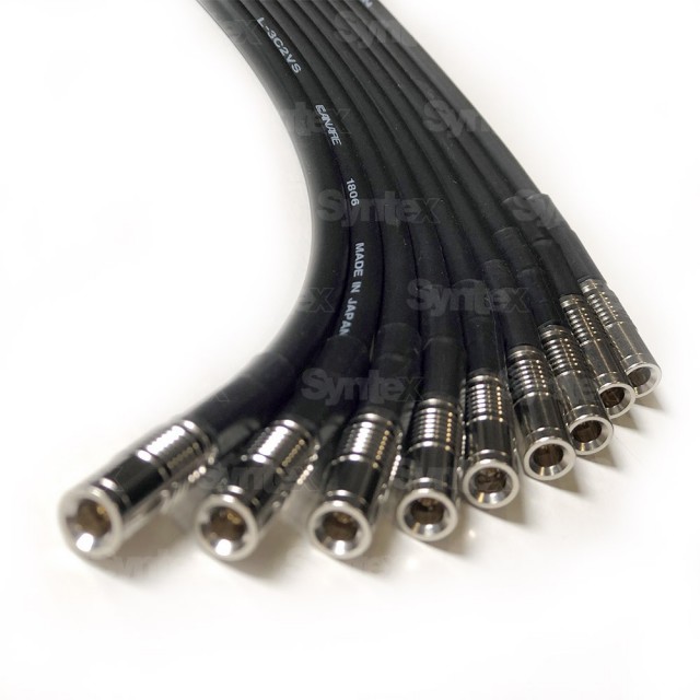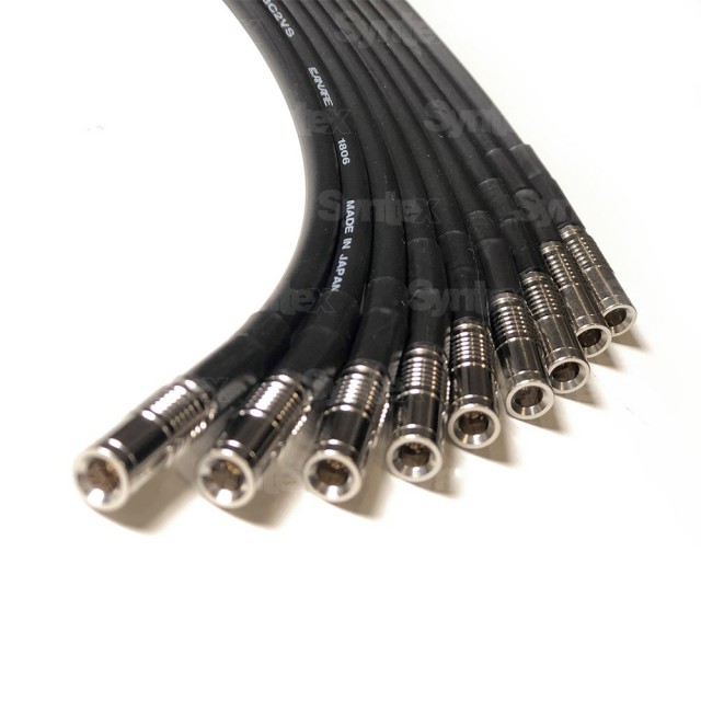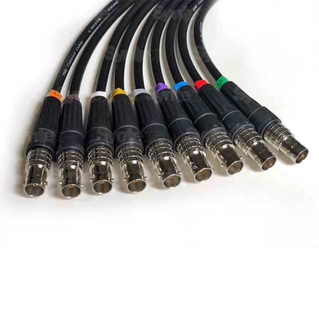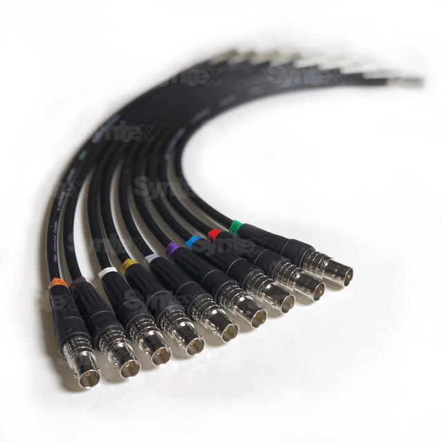 Satz von 9 Verbindungskabeln für Blackmagic Design DeckLink Quad-Karten. Der Kabelsatz besteht aus hochwertigem, flexiblem Koaxialkabel, DIN 1.0/2.3 und BNC-F-Steckern des japanischen Herstellers Canare.