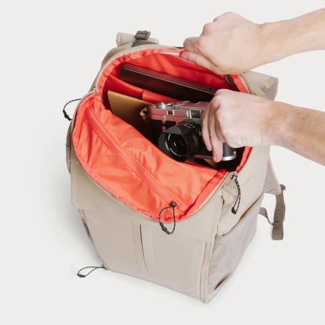 Einfaches Ein-Kammer-Design mit Zugang von oben, um schnell Dinge aus der oberen Schicht herauszunehmen, oder mit vollständigem Zugang von vorne für Fotoausrüstung. Kein Herumkramen im Rucksack mehr.