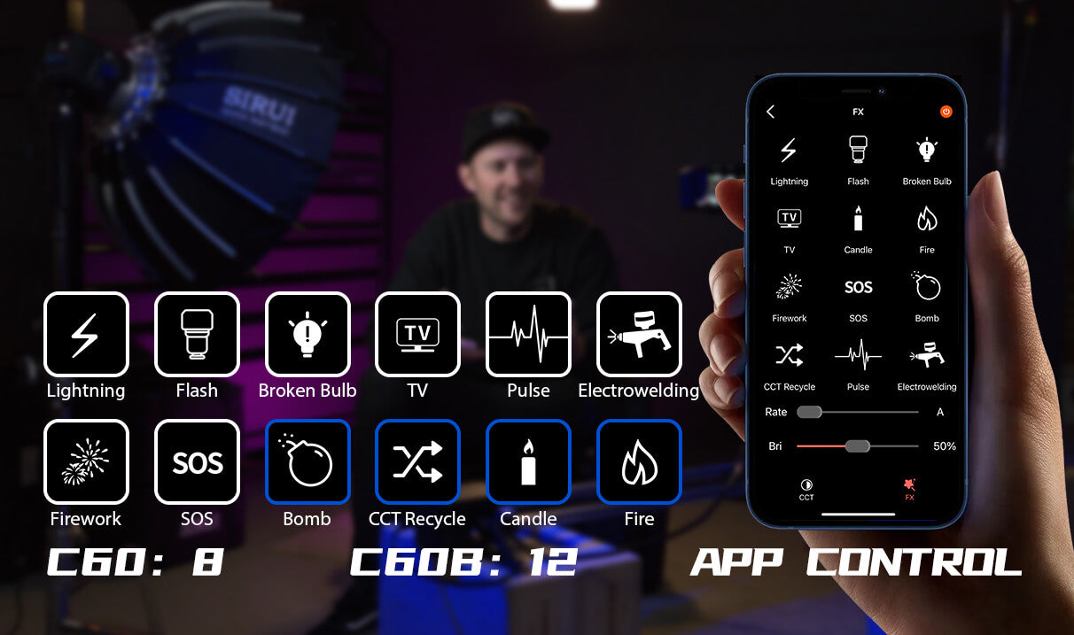 Für kreative Aufnahmen sind in der C60/C60B 12 Lichteffekte mit variabler Geschwindigkeit integriert, um eine Vielzahl von Beleuchtungsszenarien zu simulieren.