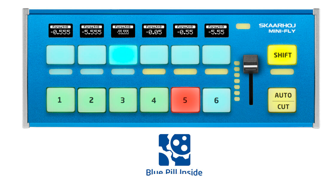 Der SKAARHOJ Mini Fly Controller mit Blue Pill ist ein kompakter Live-Produktionsmischer, der für kleine Mehrkamera-Setups entwickelt wurde. Mit programmierbaren Vier-Wege-Tasten mit OLED-Displays, RGB-Anzeige und integrierter Blue Pill-Technologie bietet er flexible Steuerung, Audioüberwachung und Übergangsmanagement in einer äußerst kompakten Bauweise.