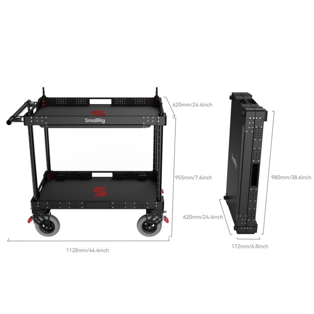 Der SmallRig 36" Lightweight Video Production Camera Cart MD4573 ist eine professionelle mobile Workstation, die für Filmemacher und Produzenten von Inhalten entwickelt wurde, die auf Effizienz, Haltbarkeit und Vielseitigkeit am Set Wert legen, um häufige Ortswechsel und einen schnellen Einsatz während der Dreharbeiten zu ermöglichen. Der aus Aluminium in Luft- und Raumfahrtqualität und industrietauglichen Materialien gefertigte Wagen kann von einem einzigen Teammitglied in nur 5 Minuten zusammengebaut oder zusammengeklappt werden. Das faltbare Design lässt sich für einen einfachen Transport auf eine Höhe von nur 17,2 cm zusammenklappen und eignet sich damit gleichermaßen für Studios in der Stadt wie auch für Drehs an abgelegenen Orten.