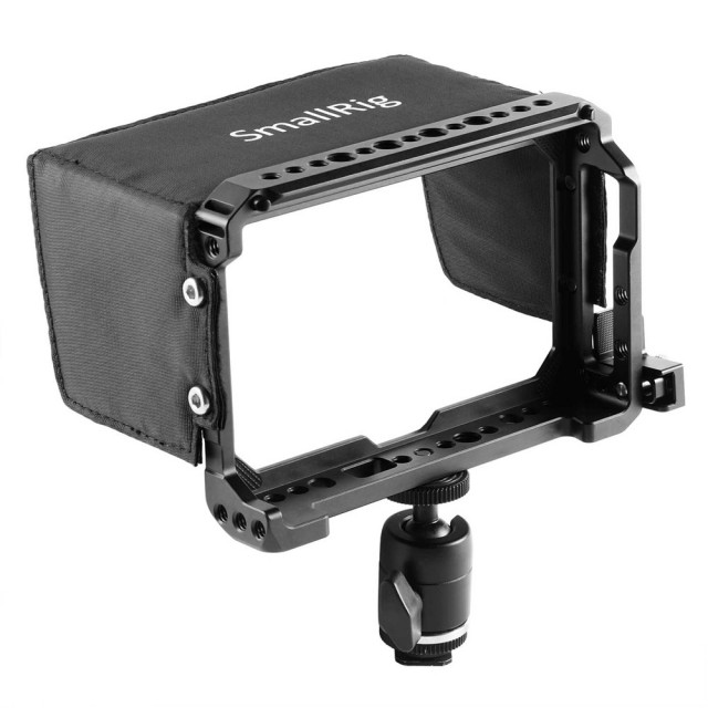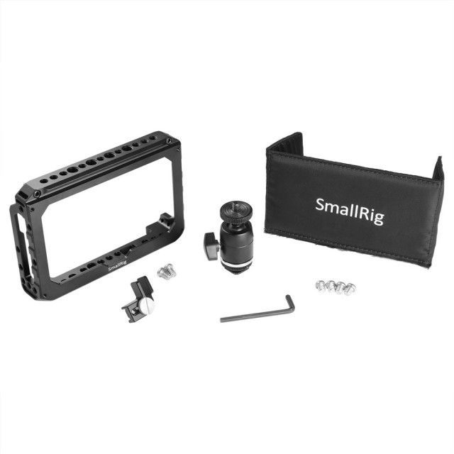 SMALLRIG Monitor Cage Accessory Kit 1981 ist ein 5'' Monitorkäfig mit Sonnenschutzdach. Dies ist eine großartige Möglichkeit, Ihren Blackmagic Video Assist Monitor zu schützen. Hergestellt aus CNC-gefrästem Aluminium, ist der Käfig sehr leicht und solide, und Sie haben trotzdem Zugang zu allen Funktionen des Monitors. Er verfügt über zahlreiche 1/4"-20- und 3/8"-16-Gewindebohrungen für zahlreiche Befestigungsmöglichkeiten. Eine integrierte und verdrehsichere NATO-Schiene an der Oberseite ermöglicht die direkte Befestigung von NATO-Standardzubehör. Die mitgelieferte HDMI-Klemme zum Schutz des HDMI-Anschlusses Ihrer Kamera. Außerdem ist eine Sonnenblende perfekt, um direktes Sonnenlicht zu verhindern und eine gute Sichtbarkeit des Bildes auf dem Bildschirm zu gewährleisten. Zusätzlich bieten wir einen SmallRig Monitorhalterungskugelkopf 1875 für eine einfache Montage an.