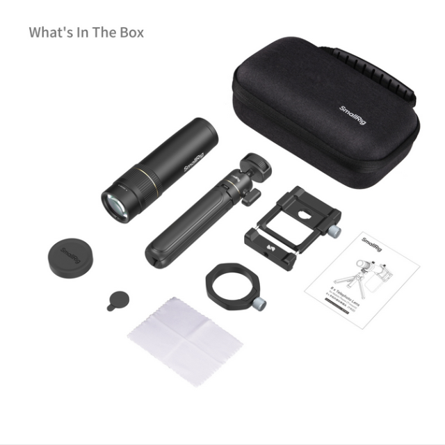 Das SmallRig 8x Teleobjektiv für Mobiltelefone (T-Mount) 4737 verbessert Ihre mobile Fotografie mit einstellbarer 8facher Vergrößerung, erstklassiger optischer Qualität und mitgeliefertem Stabilitätszubehör für gestochen scharfe, hochauflösende Aufnahmen.