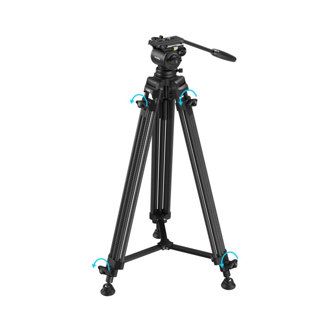 Das aus Carbonfaser gefertigte Stativ verfügt über ein 2-2-1-Segment-Bein-Design und integrierte abnehmbare Schwenkfüße, die optimale Stabilität auf unebenem oder felsigem Gelände gewährleisten. Trotz seiner robusten Konstruktion wiegt das gesamte System nur 2,7 kg (6 lb) und lässt sich daher auch in schnelllebigen Aufnahmesituationen besonders leicht transportieren.