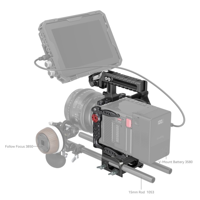 Der seitliche Griff ist für die linke und rechte Hand verfügbar, ist ergonomisch und aus Kohlefasermaterial, mit einem leichten und bequemen Griff; unterstützt eine Taste für die Drehverstellung, einfach, einen bequemen Griff und Kamerabetrieb zu halten. Der Käfig mit modularem Design, die obere Platte und die Grundplatte können unabhängig voneinander verwendet werden; Nach der Demontage der oberen Platte, kann es mit KOMODO OUTRIGGER HANDLE und DSMC3 RED TOUCH 7.0" kompatibel sein. Der Bausatz hat eingebaute 1/4"-20 Gewindebohrungen, ARRI 3/8"-16 Gewindebohrungen, 3/8"-16 Gewindebohrungen, NATO-Schienen, Cold Shoe Halterungen und andere Schnittstellen, bequem zu installieren 15mm Stabklemme 3598, Mikrofon, Magischer Arm 3873, und anderes Zubehör. Die Vorderseite des Käfigs kann zur Halterung des Objektivadapters erweitert werden, indem der Metabones-Mount-Adapter befestigt wird, um den Objektivanschluss der Kamera zu schützen und die Aufnahmestabilität zu verbessern. Nach der unteren Installation von 15mm Stangen kann erweitert werden, um Follow Focus 3850, Matte Box 3645, Objektiv Unterstützung BSL2680, etc. Ein eingebauter Schlitzschraubendreher und ein Inbusschlüssel für eine einfache Demontage und Montage.