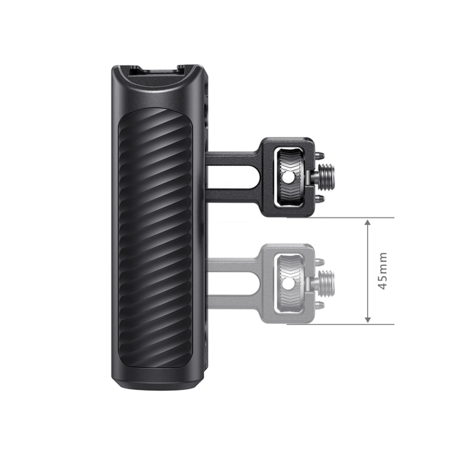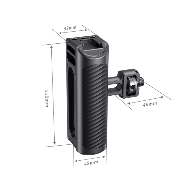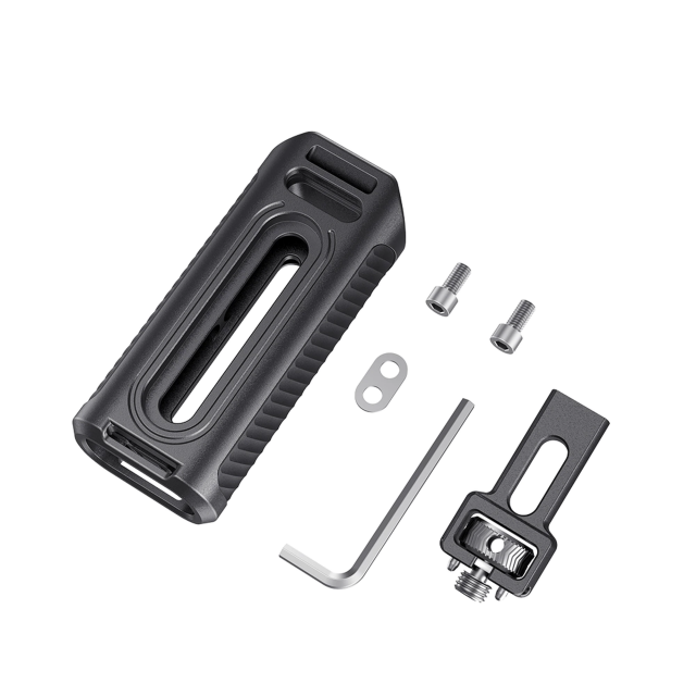 DerSmallRig Aluminum Arri Locating Side Handle HSS2426 wurde entwickelt, um Kameraleuten komfortable Handheld-Aufnahmen zu ermöglichen. Mit einem integrierten Sechskant an der Unterseite kann der Griff nach oben und unten verstellt werden, je nach Bedarf. Wenn Sie den Griff auf der anderen Seite des Käfigs verwenden möchten, können Sie den Sechskant verwenden, um das Verbindungsmetallteil des Griffs abzunehmen und die Richtung zu ändern. Der Griff kann an den Kamerakäfigen mit den Arri-Aufnahmebohrungen an der Seite befestigt werden. Er verfügt über einen Kaltlichtschuh und drei 1/4"-20-Gewindebohrungen für die Montage von Zubehör. Er wiegt nur 226 g und verfügt über ein Aluminiumgehäuse mit rutschfesten Silikongel-Belägen, um komfortable und leichte Handheld-Aufnahmen zu ermöglichen. Außerdem kann dieser Griff mit einer Handschlaufe für mehr Sicherheit verwendet werden.