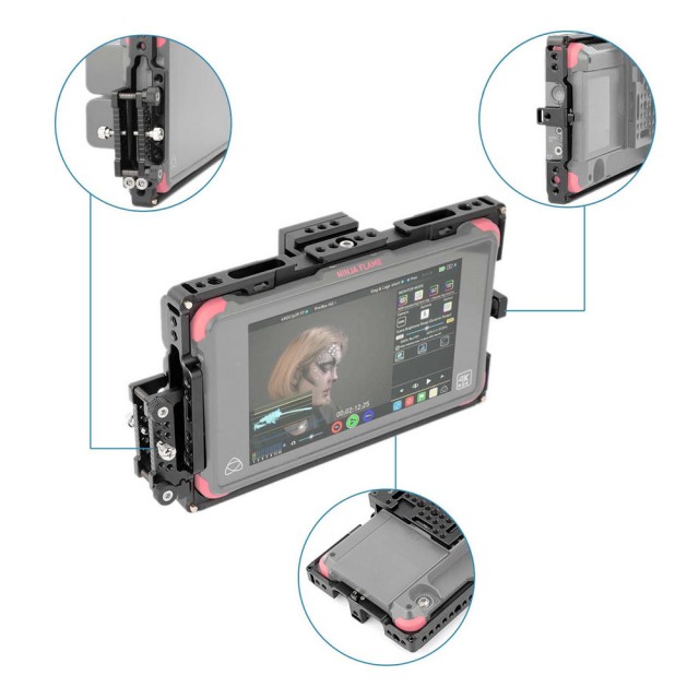 Der SmallRig Atomos 7" Monitorkäfig mit Sonnenblende 2008 wurde speziell für Atomos (Ninja flame, Shogun flame, Shogun Inferno, Ninja Inferno) entwickelt. Der Monitorkäfig wird mit 2 kalten Schuhen an der Oberseite geliefert, die mit dem Rosettengelenkarm (7") 1497 oder dem drahtlosen Mikrofonempfänger und dem drahtlosen Bildsender kompatibel sind. Die exklusiven Löcher für die Sonnenblende dienen zur Befestigung einer Sonnenblende, die den Monitor vor Sonnenlicht schützt. Die NATO-Schienen auf beiden Seiten sind mit der 15-mm-Stabklemme (parallel) 1254, dem 15-mm-Stab 1049 und dem Gummigriff 1616 für handgeführte Aufnahmen kompatibel. An den Käfig können Batterien angeschlossen werden, um während der Aufnahmen genügend Strom zu haben.