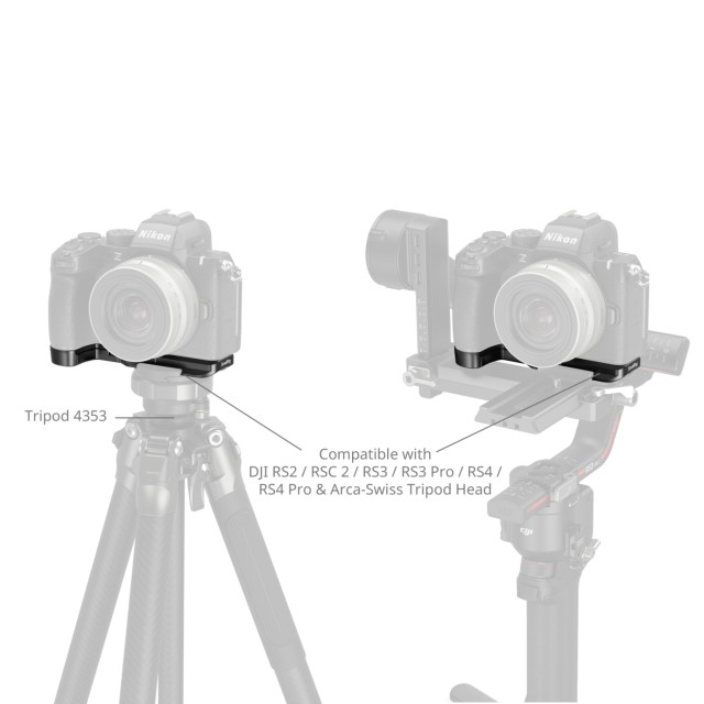 Die Platte ist mit einem integrierten 1/4"-20-Gewinde an der Unterseite ausgestattet und bietet so vielseitige Erweiterungsmöglichkeiten, wie z. B. die Anbringung des Aufnahmegriffs (ID 4551). Darüber hinaus ermöglicht die integrierte Arca-Swiss-Schnellwechselplatte den Wechsel zwischen Arca-Stativen und den DJI-Stabilisatoren RS2 / RSC 2 / RS3 / RS3 Pro / RS4 / RS4 Pro und erleichtert so den mühelosen Wechsel zwischen Handheld-, Stabilisator- und Stativ-Aufnahmen.