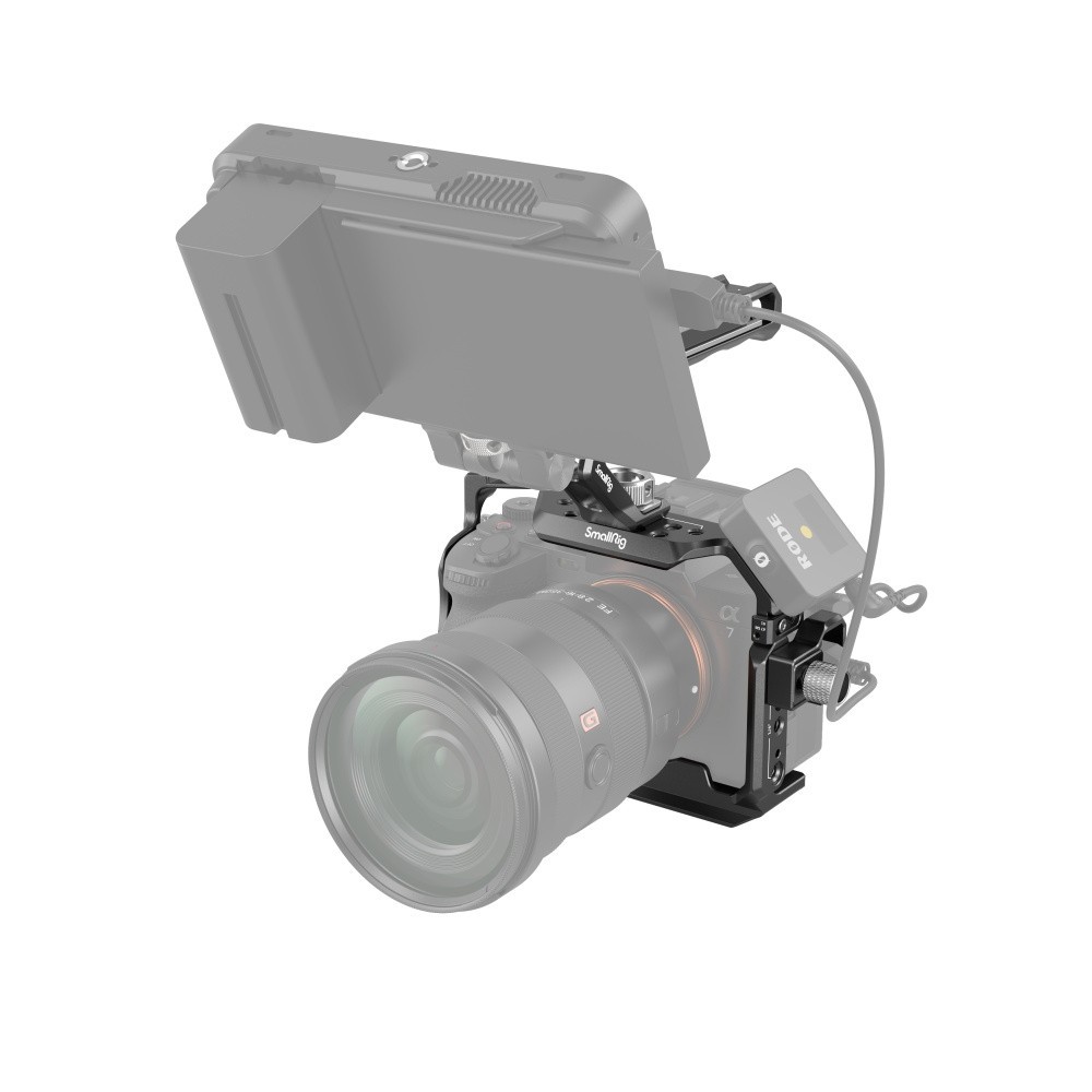 Das SmallRig Cage Kit für Sony Alpha 7R V / 7 IV / 7S III / 7 V 3668B wurde entwickelt, um Aufnahmen aus niedrigen Winkeln zu erleichtern und die Kamera zu schützen, während es gleichzeitig eine Vielzahl von Zubehörhalterungen bietet. Es umfasst einen Cage, eine HDMI-Kabelklemme und einen oberen Griff. Der obere Griff liegt angenehm in der Hand und ermöglicht ein bequemes Tragen bei Aufnahmen aus niedrigen Winkeln.