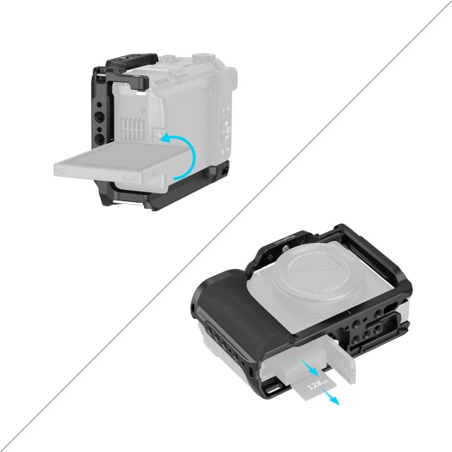 Darüber hinaus ermöglicht der Käfig den uneingeschränkten Zugriff auf alle Kameratasten und Schnittstellen, einschließlich des Batteriefachs und der Speicherkartensteckplätze.