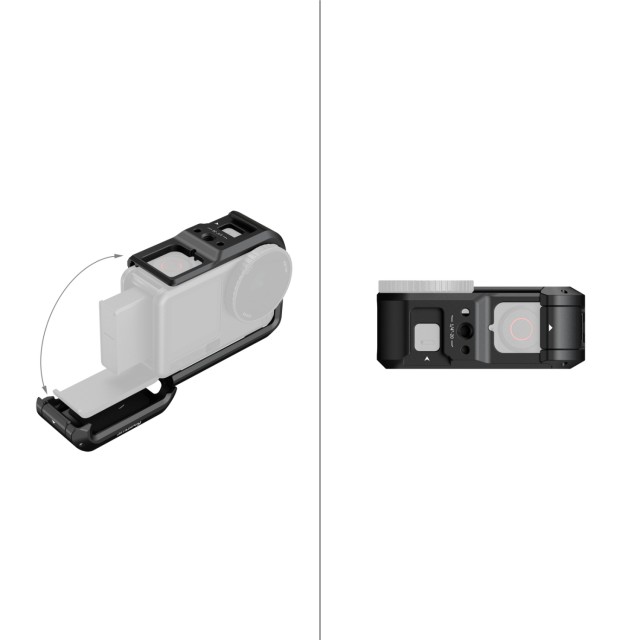 Der Cage verfügt über eine Kaltschuhhalterung zum Anbringen von Beleuchtungs- oder Audiozubehör wie dem DJI Mic 2 oder dem SmallRig Video Light (ID 5446). Darüber hinaus verfügt er über magnetische Schnellverschlüsse an der Seite, die mit dem originalen Dual-Direction Quick-Release Adapter Mount von DJI kompatibel sind. Das offene Design ermöglicht den direkten Zugriff auf den magnetischen Schnellverschluss der Kamera und ermöglicht in Kombination mit den Dual-Mount Quick Release Supports (5890, 5779, 5991) von SmallRig schnelle Übergänge zwischen horizontalen und vertikalen Aufnahmen.