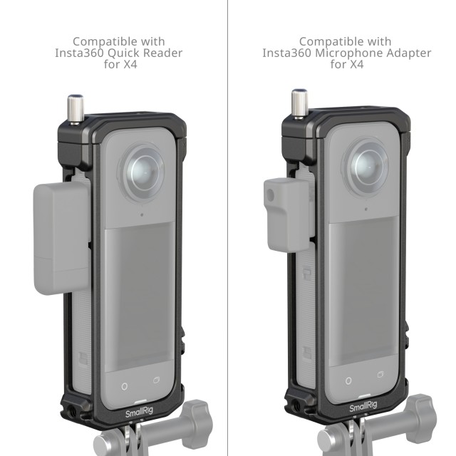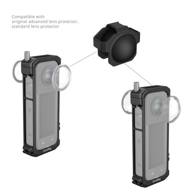 SmallRig Cage für Insta360 X4 4278 bietet Schutz für die Kamera und eine Vielzahl von Erweiterungszubehör für zusätzlichen Komfort während der Aufnahme. Durch das Design mit seitlichen Aussparungen bietet der Käfig ungehinderten Zugang zum Batteriefach und ermöglicht einen schnellen Batteriewechsel ohne Demontage des Käfigs. Der Käfig liegt eng an der Action-Kamera an und ist innen mit Silikonpolstern ausgestattet, um Kratzer am Kameragehäuse zu vermeiden. Die Kamera wird von oben in den Käfig eingesetzt und mit einer Rändelschraube gesichert, so dass für die Installation kein Werkzeug erforderlich ist. Der Käfig verfügt über einen Kaltschuhanschluss und eine seitliche 1/4"-20-Gewindebohrung zur Befestigung von Mikrofonen, LED-Videolicht und anderem Fotozubehör. Das untere Action-Kamera-Interface kann zur Aufbewahrung zusammengeklappt werden und verfügt außerdem über eine 1/4"-20 Gewindebohrung zur direkten Befestigung von 1/4"-20 Schraubenstativen, Selfie-Sticks(4758) und mehr. Im Lieferumfang enthalten ist eine Silikon-Linsenkappe zum Schutz des Objektivs bei der Aufbewahrung.