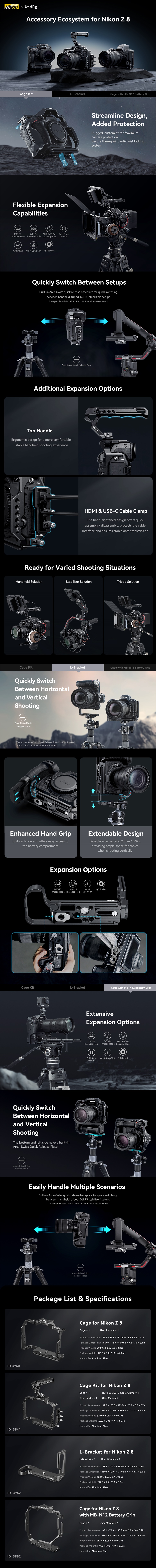 SmallRig Cage für Nikon Z 8 mit MB-N12 Batteriegriff 3982 ist zum Schutz der Kamera und zur Befestigung von Zubehör konzipiert. Die Kamera wird mit einer 1/4"-20-Schraube an der Unterseite und einer M2,5-Schraube an beiden Seiten befestigt. Gummipuffer verhindern Kratzer und bieten vollen Zugriff auf Tasten, Kartensteckplätze, Batteriefach und Klappbildschirm. Zu den Befestigungspunkten für das Zubehör gehören eine 1/4"-20- und eine 3/8"-16-Gewindebohrung sowie eine 3/8"-16-Aufnahmebohrung von ARRI für den oberen Handgriff 2165 und 1638, den seitlichen Handgriff 2093 und 2425, die Monitorhalterung 2903 und 2904 sowie den Magic Arm 3875. Zwei Kaltschuhhalterungen ermöglichen die Befestigung eines Mikrofons und einer LED-Videolampe, und die Arca-Swiss-Schnellwechselplatte an der Unterseite und die Seitenplatte ermöglichen horizontale und vertikale Aufnahmen auf Stativen. Die untere Arca-Swiss-Schnellwechselplatte unterstützt auch DJI RS 2 / RSC 2 / RS 3 / RS 3 Pro Gimbals für einen schnellen Wechsel zwischen Handheld-, Gimbal- und Stativmodus. An der Vorderseite befinden sich zwei 1/4"-20 Gewindebohrungen für Dual 15mm Rod Clamp 942, Matte Box, Objektivhalterung; und eine 1/4"-20 Aufnahmebohrung für Single Rod Clamp 3276 für Focus Follower. Außerdem ist ein magnetischer, doppelseitiger Schraubenschlüssel für eine einfache Demontage und Montage enthalten.
