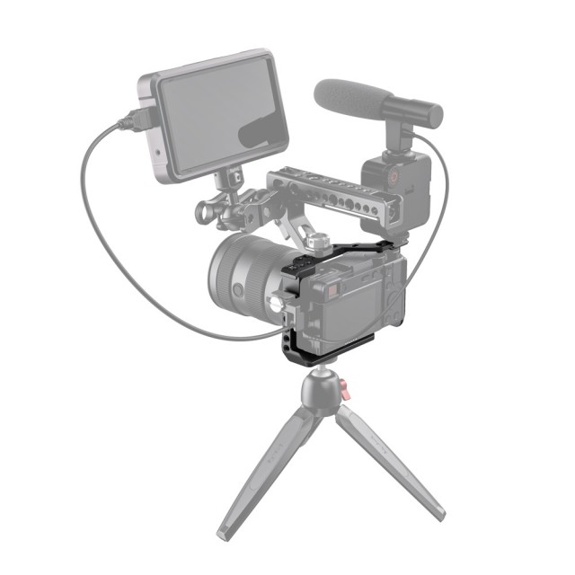 Der SmallRig-Käfig für das Sony A6600 CCS2493 bietet Schutz und Befestigungsgewinde für Zubehör wie Monitore, Mikrofone, Leuchten und Griffe. Der Käfig wird mit einer 1/4"-20 Bodenschraube und einer M2,5-Schraube an der Unterseite der Kamera befestigt, um ein Verdrehen des Käfigs zu verhindern. Sie ist mit mehreren 1/4"-20-, 3/8"-16- und Arri 3/8"-16-Zubehörlöchern ausgestattet, um die Montage des oberen Griffs 2165, der Monitorhalterung 2294 und der Monitorhalterung 2348 zu ermöglichen.
