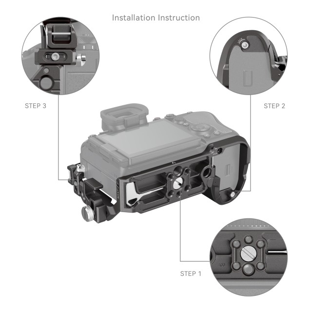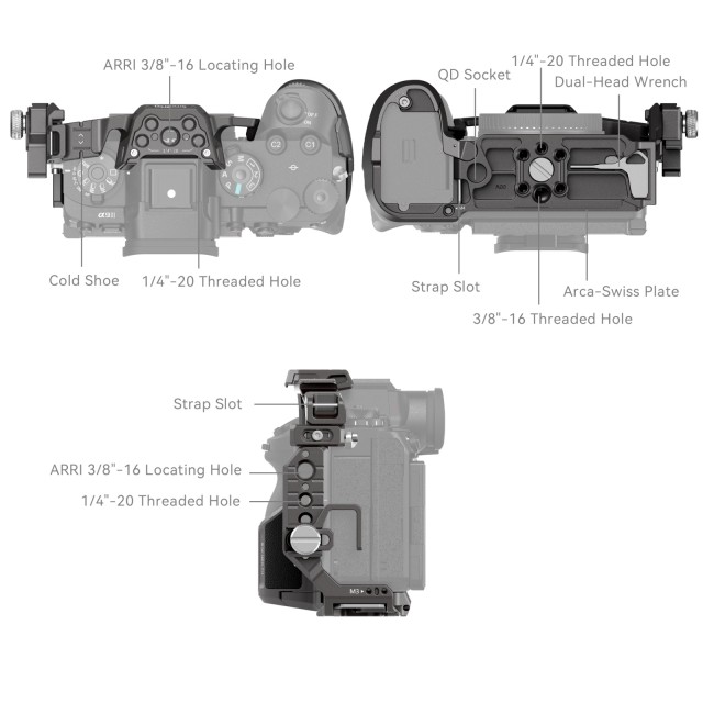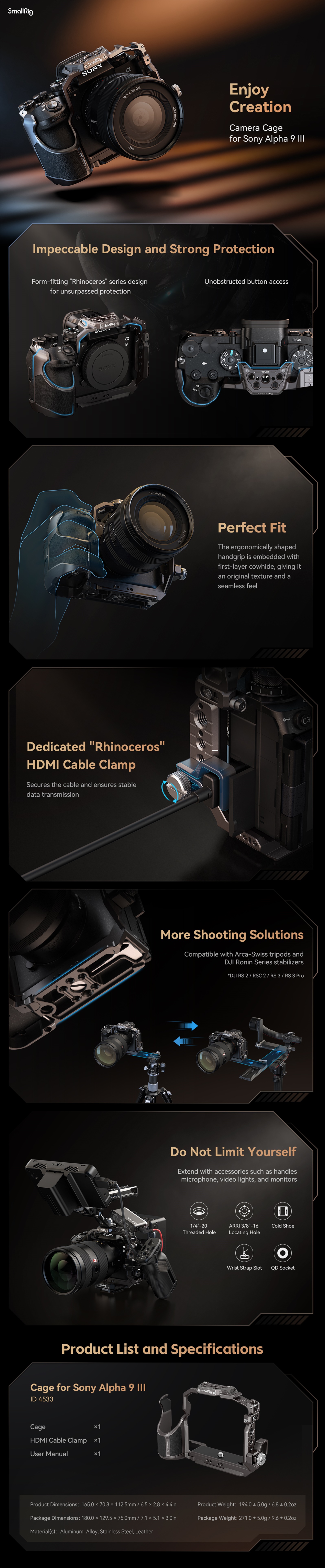 SmallRig Cage für Sony Alpha 9 III 4533 wurde entwickelt, um die Kamera zu schützen und mit Zubehör zu erweitern. Das Dreipunkt-Verriegelungssystem sichert die Alpha 9 III mit Hilfe von Fixierstiften, einer 1/4"-20 Schraube auf der Unterseite und einer M2,5 Schraube auf der linken Seite. Das stromlinienförmige Design des Käfigs gewährleistet einen ungehinderten Zugang zu den Tasten und sorgt so für ein komfortables Nutzungserlebnis. Die spezielle "Rhinoceros"-HDMI-Kabelklemme sichert die Kabel mit Rändelschrauben, um die HDMI-Anschlüsse zu schützen und eine stabile Datenübertragung zu gewährleisten. Zu den zahlreichen integrierten Befestigungsschnittstellen gehören 1/4"-20 Löcher und ARRI 3/8"-16 Befestigungslöcher zur Anbringung eines oberen Griffs (ID: 2165C) oder eines seitlichen Griffs (ID: 4016), ARRI 3/8"-16 Befestigungslöcher zur Erweiterung der Monitorhalterung (ID: 2903B), Kühlschuhe für Mikrofon oder LED-Videolicht, QD-Buchse für QD-Schultergurt. Die eingebaute Arca-Swiss Schnellwechselplatte an der Unterseite ist kompatibel mit DJI RS 2 / RSC 2 / RS 3 / RS 3 Pro, DJI RS 2 / RSC Stabilisatoren mit Schnellwechselplatten und Arca-Swiss Schnellwechselplatte (ID: 3154). Die Gurtlöcher auf der linken Seite und am Boden des Käfigs sind mit der Handschlaufe (ID: 3848), dem Schultergurt (ID: PSC2428) und anderem Zubehör kompatibel. Außerdem ist ein Magnetschlüssel an der Unterseite des Käfigs jederzeit für eine einfache Demontage und Montage zugänglich.