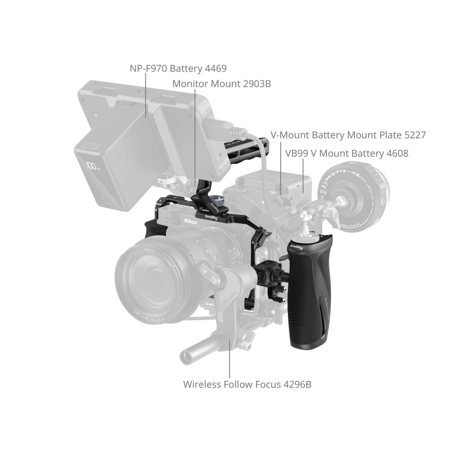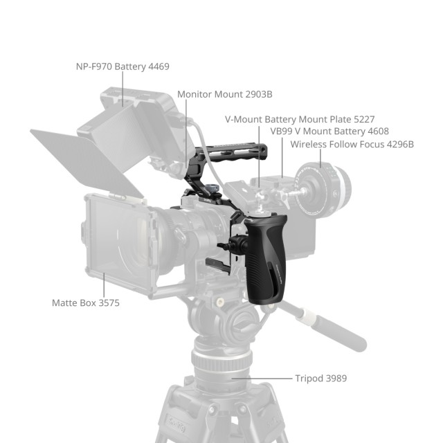 Der Cage bietet umfangreiche Erweiterungsmöglichkeiten, darunter mehrere 1/4"-20-Gewindebohrungen und Positionierungsbohrungen für die Befestigung von Zubehör wie Seitengriffen (ID 5532) oder Magic Arms (ID 5308, 4900). Außerdem verfügt er über 3/8"-16 ARRI-Positionierungslöcher zur Befestigung von Monitorhalterungen (ID 2903B) oder Top-Handgriffen (ID 5252, 3765). Integrierte Kaltschuhhalterungen ermöglichen die Befestigung von Mikrofonen (kompatibel mit DJI MIC 2) oder Leuchten (ID 4660), während die QD-Buchse an der Unterseite QD-Schultergurte (ID 4118B) unterstützt. Zusätzlich bieten Gurtschlitze Platz für Handgelenkgurte (ID 3848) oder Schultergurte (ID 4882, 5208).