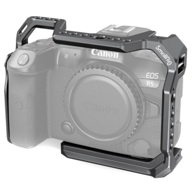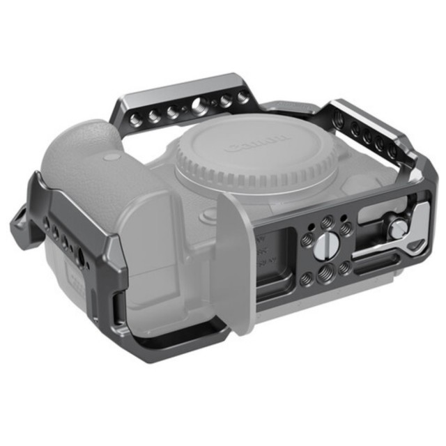 Mit diesem Kamerakäfig-Kit mit Seitengriff von SmallRig können Sie Ihre Canon EOS R5 oder R6 Kamera mit Schutz und diversem Zubehör ausstatten. Das Kit enthält einen kompletten Kamerakäfig, einen seitlichen Holzgriff und eine HDMI/USB Typ-C-Kabelklemme.