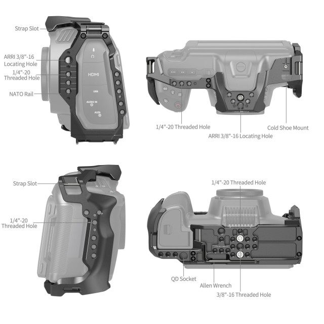 Der SmallRig Kamerakäfig für die Blackmagic Design Cinema Camera 6K 4785 wurde für handgeführte Aufnahmen mit sanften Kamerabewegungen entwickelt. Es schützt die Kamera und bietet gleichzeitig verschiedene Erweiterungsmöglichkeiten. Das Dreipunkt-Verriegelungssystem sichert die Kamera mit zwei 1/4"-20 Schrauben an der Unterseite und einer 1/4"-20 Schraube an der Oberseite, während integrierte Silikonpolster Kratzer verhindern. Der Käfig bietet ungehinderten Zugang zu allen Schnittstellen der Kamera, den Kartensteckplätzen, dem Klappbildschirm und dem Batteriefach. Die Objektivadapterhalterung ist mit Sigma MC-31, Sigma MC-21 und ähnlichen Objektivadaptern kompatibel und schützt die Kamera vor Beschädigungen. Der Käfig verfügt über 1/4"-20-Gewindebohrungen, 3/8"-16-Gewindebohrungen und ARRI-Aufnahmebohrungen zur Befestigung von Zubehör wie Seitengriffen(2093, 4016), oberen Griffen(2165C), Monitorhalterungen(2903, 2904), Manfrotto-Basisplatten(1280, 2458), Stativen(3989) und mehr. Die integrierten 1/4"-20- und 3/8"-16-Gewindebohrungen, die ARRI-Positionierungsbohrungen und die Kaltschuhbefestigung ermöglichen zudem die Anbringung von Zubehör wie z. B. Magic Arms(3873), Kabelklemmen(3271, 3289, 2960) und Schutzabdeckungen für die Schnittstellen, um Signalverluste zu vermeiden. Zwei 1/4"-20-Gewindebohrungen am Handgriff verhindern ein Verdrehen der Kamera im Hochformat. Der Schieber auf der linken Seite ermöglicht das schnelle Anbringen von Schiebe-Drehgriffen(3847) und Schiebegriffen(4017) und erleichtert die schnelle Montage von Zubehör. Die eingebauten Halterungen für den kalten Schuh eignen sich für Mikrofone, LED-Videoleuchten, SSD-Halterungen (ID 3272) und vieles mehr. Außerdem verfügt es über Gurtschnittstellen, die mit Handgelenkgurten(3848) und Schultergurten(2793) kompatibel sind. Die QD-Schnittstelle ermöglicht die nahtlose Integration von QD-Schnellverschluss-Schultergurten(4118). Der Käfig kann in ein halbes Gehäuse für Stabilisatoren umgewandelt werden, was eine einfache Nivellierung gewährleistet. Zusätzlich verfügt der Käfig über einen magnetischen Inbusschlüssel an der Unterseite, um die Montage und Demontage von Zubehör zu erleichtern.