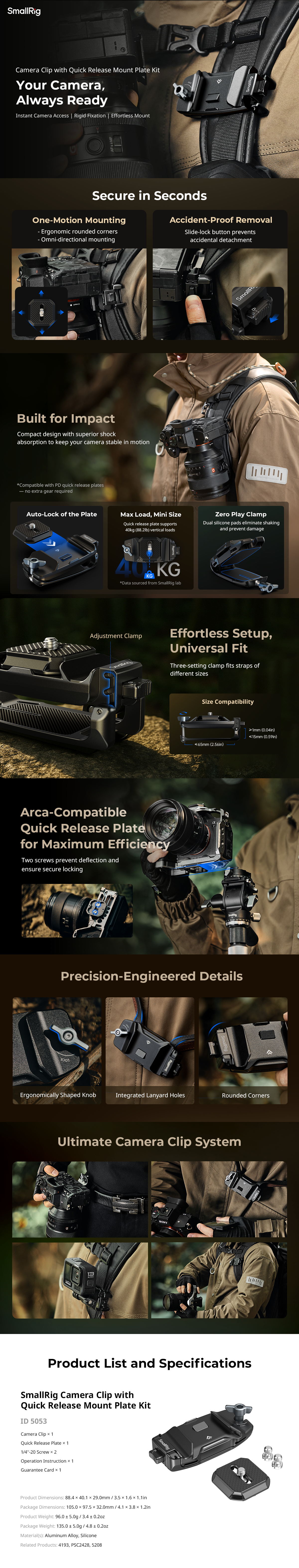 Das SmallRig Camera Clip with Quick Release Mount Plate Kit 5053 wurde speziell für Fotografen entwickelt, die immer in Bewegung sind. Das Kit enthält einen Kameraclip, eine Schnellwechselplatte und eine 1/4''-20 Schraube und bietet ein benutzerfreundliches Design: Die Schnellwechselplatte kann in jede Richtung eingesetzt werden und rastet automatisch ein. Die Schnellwechselplatte kann in jede beliebige Richtung eingesetzt werden und rastet automatisch ein. Sie unterstützt außerdem eine einfache Entriegelung, die eine hocheffiziente Montage und Demontage gewährleistet.