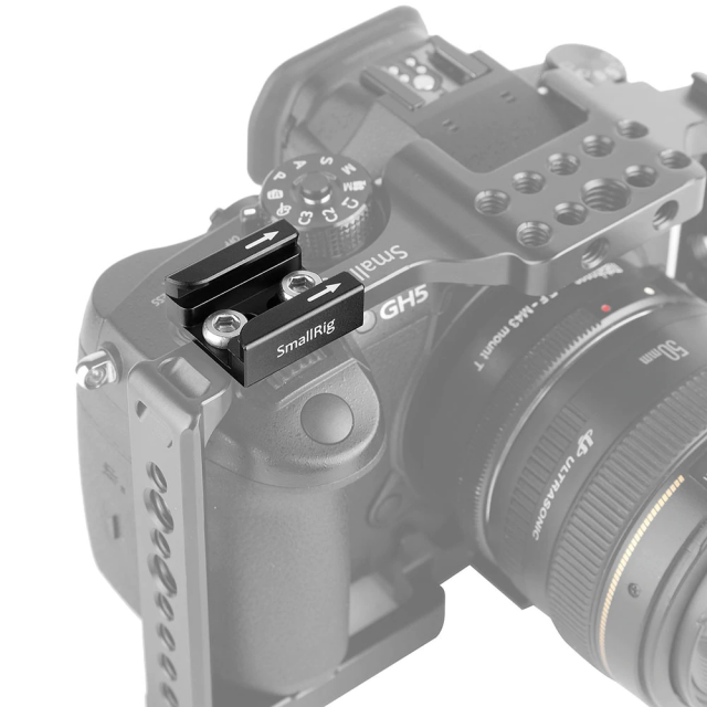 Der SmallRig Cold Shoe 1960 wird mit zwei 1/4"-Löchern zur Befestigung des Käfigs 2646 für die Panasonic GH5 und GH5S, einer Deckplatte für den Blackmagic Ursa Mini/Mini Pro 1958, einer Seitenplatte für den Blackmagic Ursa Mini/Ursa Mini Pro 1854, einem neuen Doppelgriff (Käse) 1625 und einer NATO-Klemme 1885 mit zwei 1/4"-Schrauben geliefert. Zwei Pfeilspitzen weisen auf einen eingebauten Höcker hin, und der Rosettengelenkarm (7") 1497, das Mikrofon und der drahtlose Mikrofonempfänger usw. können am kalten Schuh befestigt werden. Die eingebaute Stoßstange ermöglicht eine gute Befestigung des Zubehörs. Außerdem wird in den 1/4-Zoll-Löchern zwischen der Mutter und dem Blitzschuh etwas Platz gelassen, damit die Kontakte des Blitzschuhs geschützt sind.