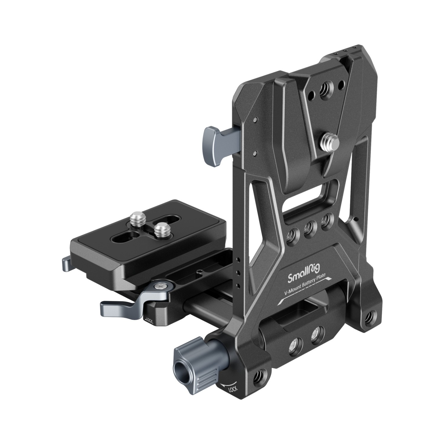 DasSmallRig Compact V-Mount BatteryMountingSystem 4064isteine kompakte, leichte und praktische All-in-One-Befestigungslösung für V-Mount-Akkus. Das Kit besteht aus einer V-Mount-Akkuplatte, einer Arca-Schnellwechselplatte und einer V-Mount-Platte. Insbesondere die Grundplatte kann so verlängert werden, dass sie für spiegellose Kameras und DSLRs verschiedener Größen geeignet ist, was durch die werkzeuglose Installation und Einstellung schnell und zeitsparend möglich ist. Im Gegensatz zu Käfigen mit integrierter Arca-Platte kann es die Kamera und die Gimbals der DJI RS-Serie über die Arca Swiss Schnellwechselplatte direkt tragen. Die V-Mount-Batterieplatte mit 1/4"-20-Gewindebohrungen und einer V-Mount-Platte bietet mehr Stromversorgungslösungen durch die Befestigung der NP-F-Batterieadapterplatte Professional Edition 3168 oder der Halterung für tragbare Powerbanks BUB2336. Dank der unteren Arca-Platte ist auch der Wechsel zwischen Handaufnahmen und Stativaufnahmen einfacher. Die um 90 Grad drehbare V-Mount-Batterieplatte lässt genügend Platz für einen Klappbildschirm, wobei eine Schwenkdämpfung verhindert, dass Ihr Gerät herunterfällt. Sie kann für mehr Kompaktheit und Tragbarkeit heruntergeklappt werden.
