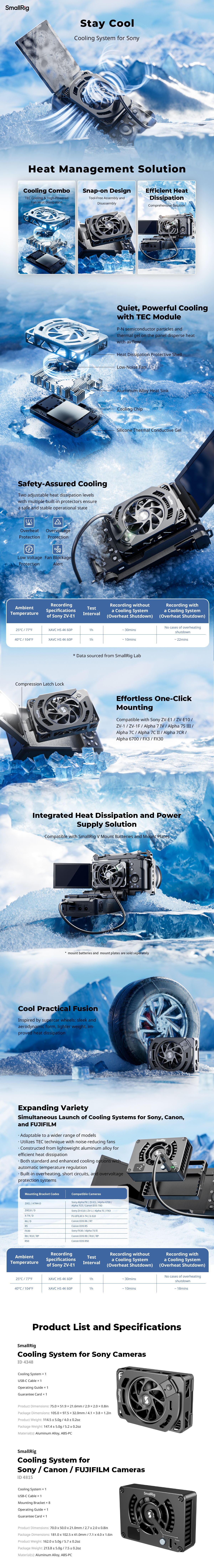 Das SmallRig Cooling System für Sony / Canon / FUJIFILM Kameras 4815 wurde entwickelt, um spiegellose Sony-Kameras zu kühlen und die Aufnahmedauer hochwertiger Videos zu verlängern. Das Kühlsystem nutzt einen hocheffizienten Lüfter mit einem TEC-Kühlmodul, um die Kamera schnell zu kühlen und Überhitzungsprobleme effektiv zu beseitigen. Eingebautes intelligentes Temperaturkontrolldesign, das Kühlsystem passt die Leistung des Kühlsystems automatisch an die Temperatur der Kontaktfläche zwischen dem Kühlsystem und der Kamera an, einfach zu bedienen. Schnappbefestigung, einfach zu entfernen und zu installieren, kompatibel mit mehreren Modellen. Kann mit oder ohne Kamerakäfig verwendet werden und ist leichter und freier in der Handhabung. Das Kühlsystem ist kompatibel mit dem V-Mount Battery Mount Plate Kit 4064B / 4063B, mit V-Mount-Akku 3579 / 3580 / 4292 verwenden, Wärmeableitung und Stromversorgung ohne Sorgen.