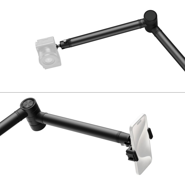 SmallRig Desk Overhead Photography / Live Streaming Bracket 4324 besteht aus einer dreiteiligen Tischhalterung, einem Telefonclip, einem Kugelkopf und Kabelbindern, die in erster Linie zum Anschluss von Geräten wie Telefonen, spiegellosen Kameras und Webcams für Live-Streaming, Videokonferenzen, Overhead-Fotografie, Unboxing-Videos und mehr verwendet werden. Die Tischhalterung mit einer ⌀30 mm langen zentralen Stange ist aus einer Aluminiumlegierung gefertigt, die eine robuste Stabilität bietet und bis zu 2 kg tragen kann. Der dreiteilige Auslegerarm ist mit hydraulischen Dämpfungsgelenken verbunden, die eine hängende Positionierung an jedem Punkt ermöglichen und die Sicherheit der Ausrüstung gewährleisten, indem sie ein plötzliches Lösen verhindern und gleichzeitig eine präzise Einstellung der Aufnahmewinkel ermöglichen. Der integrierte Anti-Deflection-Kugelkopf mit 1/4"-20-Schraube sorgt für flexible Einstellungen und breite Kompatibilität mit Kameras, Action-Kameras, Handys, Webcams und anderen Geräten für Multi-Winkel-Aufnahmen.