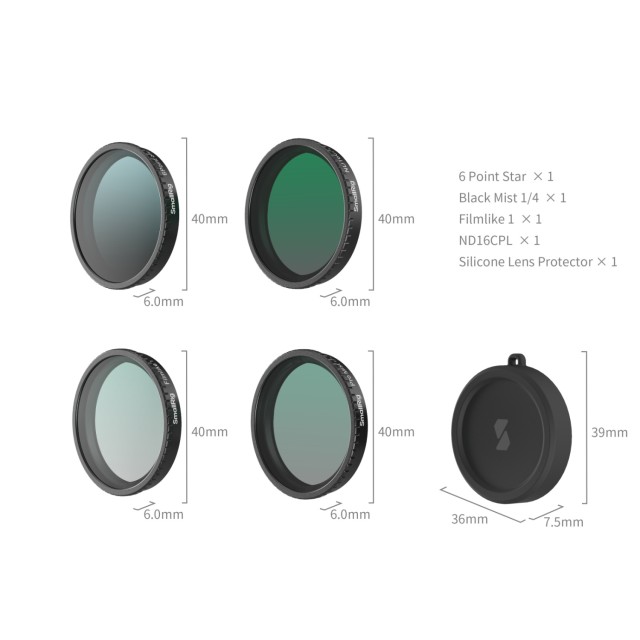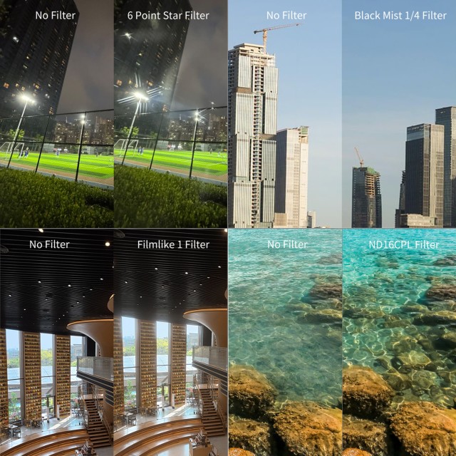 Dieses Kit enthält einen 1/4-Schwarznebelfilter, einen ND16- und CPL-Filter, einen Filmsimulationsfilter, einen Sternkreuzfilter und eine Silikonlinsenabdeckung. Der 1/4-Schwarznebelfilter mildert Spitzlichter ab und sorgt so für einen verträumten, filmischen Effekt. Der ND16 & CPL-Filter eliminiert Reflexionen und sorgt für eine originalgetreue Farbwiedergabe, wodurch er sich ideal für Landschafts- und Architekturaufnahmen unter hellen Bedingungen eignet. Der Filmsimulationsfilter erzeugt analoge Filmtöne, die sich perfekt für Porträts, Straßenfotografie und Bilder im Vintage-Stil eignen. Der Sternenkreuz-Filter verwandelt punktförmige Lichtquellen in dramatische 6-Punkt-Sternenbilder bei Nachtaufnahmen. Für zusätzlichen Komfort und Schutz enthält das Set eine weiche Silikonlinsenabdeckung, die das Objektiv Ihrer Kamera vor Kratzern und Staub schützt, wenn es nicht benutzt wird.
