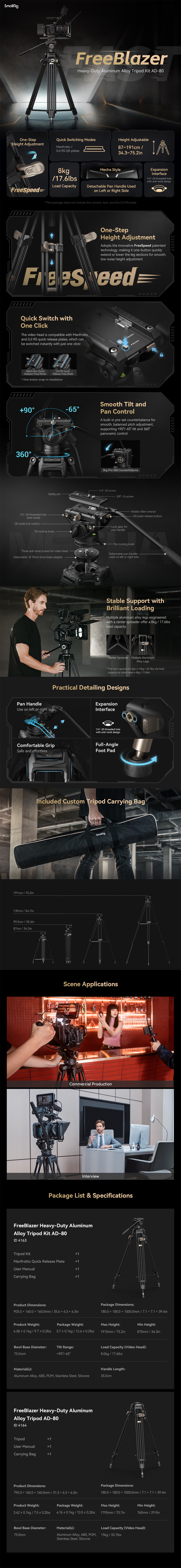 SmallRig FreeBlazer Heavy-Duty Aluminum Alloy Tripod AD-80 4164 ist ein Videostativ, das Videoaufnahmen erleichtert. Das Stativ verfügt über verstellbare Beine, die mit Hilfe von Schnappverschlüssen schnell ein- und ausgefahren werden können, mit einer Höhe von 76 cm bis 179,5 cm und einer zusammengeklappten Länge von 79,5 cm. Das Stativ verfügt außerdem über eine 1/4"-20-Gewindebohrung, um den magischen Arm und anderes Zubehör zu befestigen. Weitere Merkmale sind die Stativbeine aus einer Aluminiumlegierung, die leicht und stabil sind, sowie eine maßgeschneiderte Tragetasche zur besseren Aufbewahrung, zum Schutz und zum Transport.