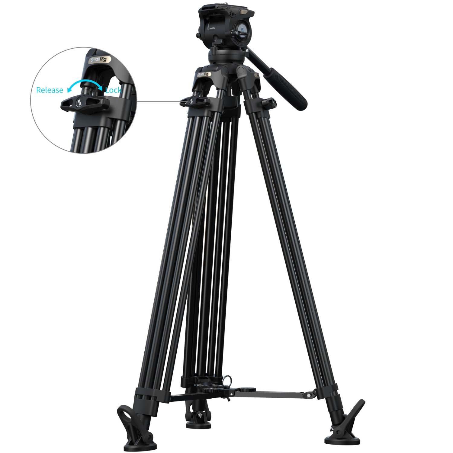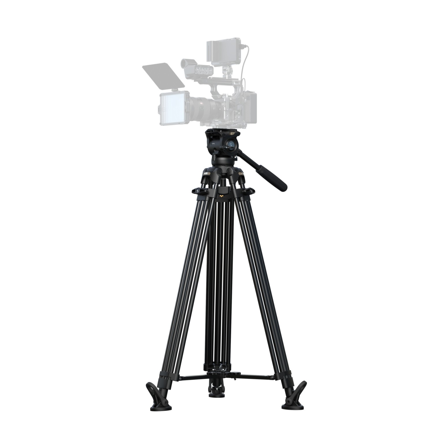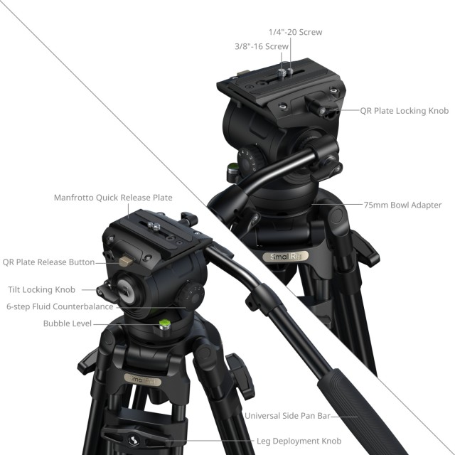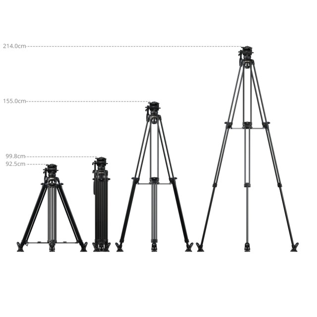 Ausgestattet mit einem Fluidkopf mit 6-stufigem Gegengewichtsmechanismus trägt das Stativ Lasten von 0 kg bis 6 kg (0–13,2 lb), während der Kopf sicher mit 10 kg (22 lb) betrieben werden kann und eine maximale Nutzlast von 15 kg (33,1 lb) aufnehmen kann. Seine Arbeitshöhe reicht von 92,5 cm bis 214 cm (36,4–84,3 Zoll) und ermöglicht reibungsloses Schwenken, Neigen und Aufnahmen aus erhöhter Position.