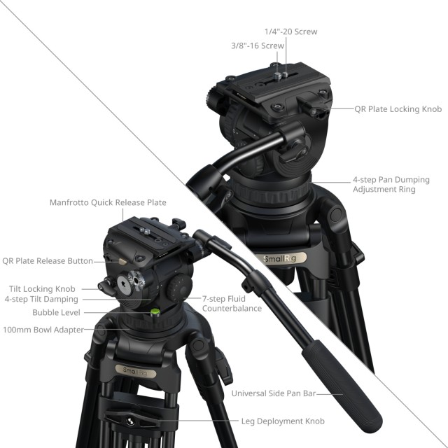 In Kombination mit einem Fluidkopf bietet das Stativ eine 7-stufige Gegengewichtsfunktion und eine unabhängige 4-stufige Neigungs- und Schwenkdämpfungssteuerung. Der Gegengewichtsmechanismus unterstützt Lasten von 4 kg bis 10 kg (8,8–22 lb), während der Kopf ein sicheres Betriebsgewicht von 15 kg (33,1 lb) und eine maximale Nutzlast von 17 kg (37,5 lb) aufnehmen kann. Die Arbeitshöhe reicht von 89,8 cm bis 200,5 cm (35,4–78,9 Zoll) und ermöglicht sowohl Aufnahmen aus großer Höhe als auch flüssige filmische Bewegungen.