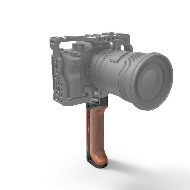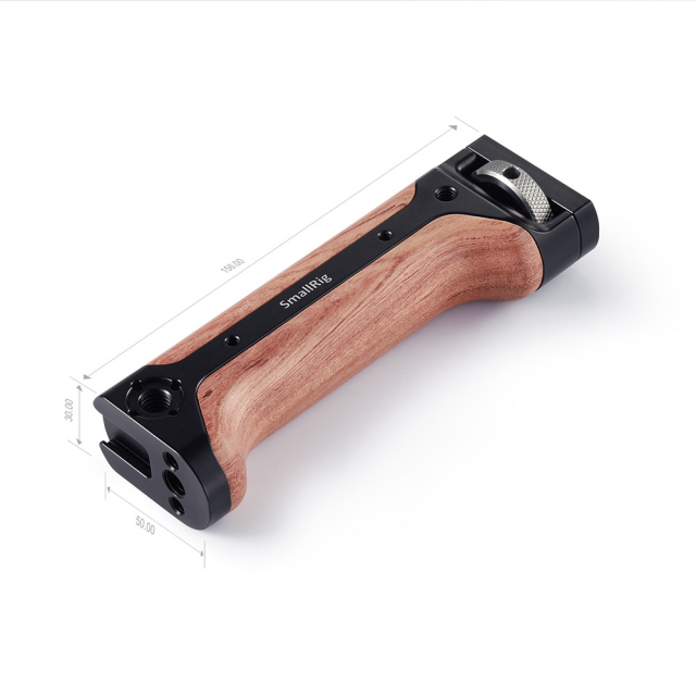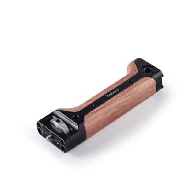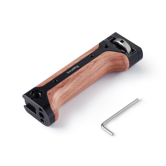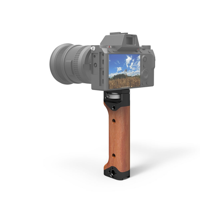Er ist auch als Universalhandgriff für alle Handkardans und DSLRs mit 1/4"-20-Gewindebohrungen an der Unterseite konzipiert. Er verfügt über 1/4"-20, 3/8"-16 und Arri-Bohrungen für die Anbringung eines Monitors und Mikrofons auf der Oberseite oder an der Seite. Der Griff ist mit einem kalten Schuh an der Oberseite ausgestattet, der den direkten Anschluss eines Mikrofons oder eines SmallHD Monitor Tilt Arms ermöglicht. Der Schnellspanngriff ist mit einer Rändelschraube einfach zu montieren und verfügt über Löcher für einen Inbusschlüssel, um ihn wieder festzuschrauben. Der ergonomische Holzgriff ist leicht und liegt angenehm in der Hand.