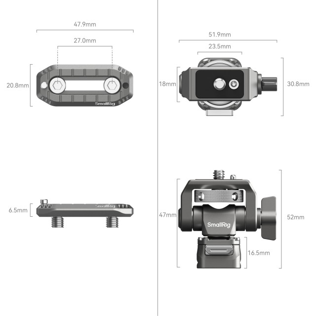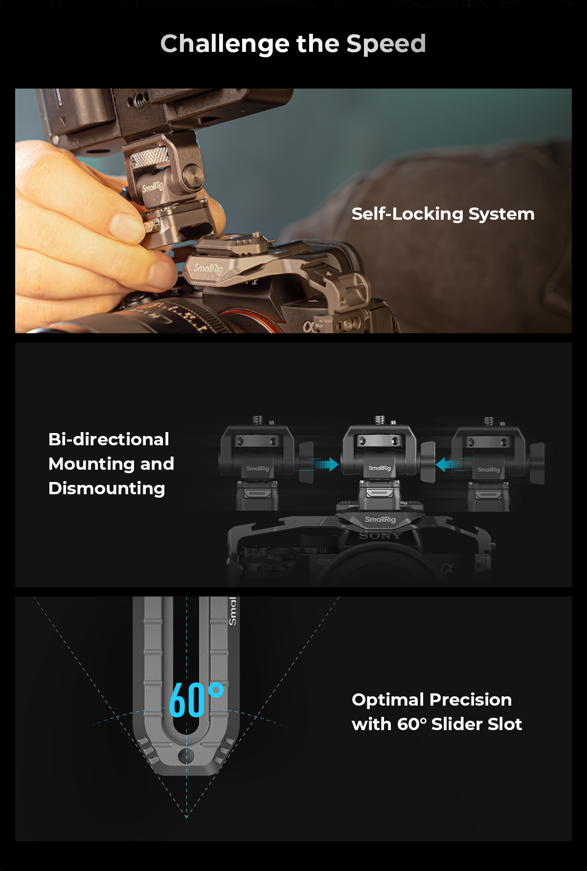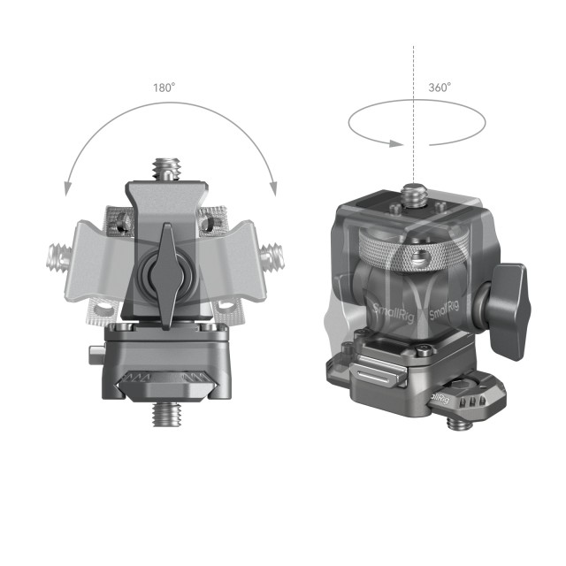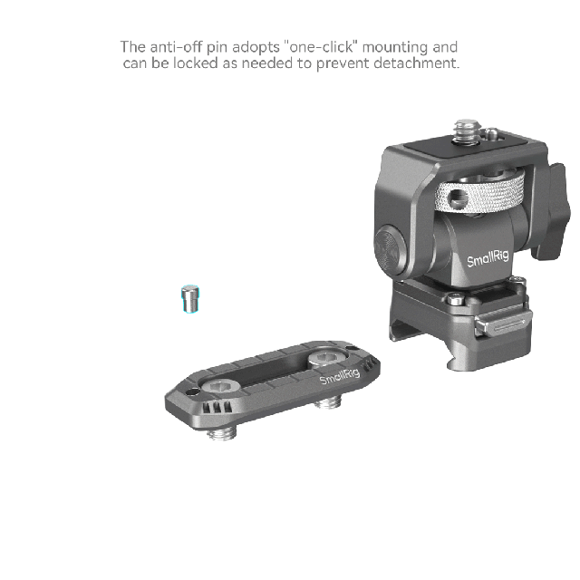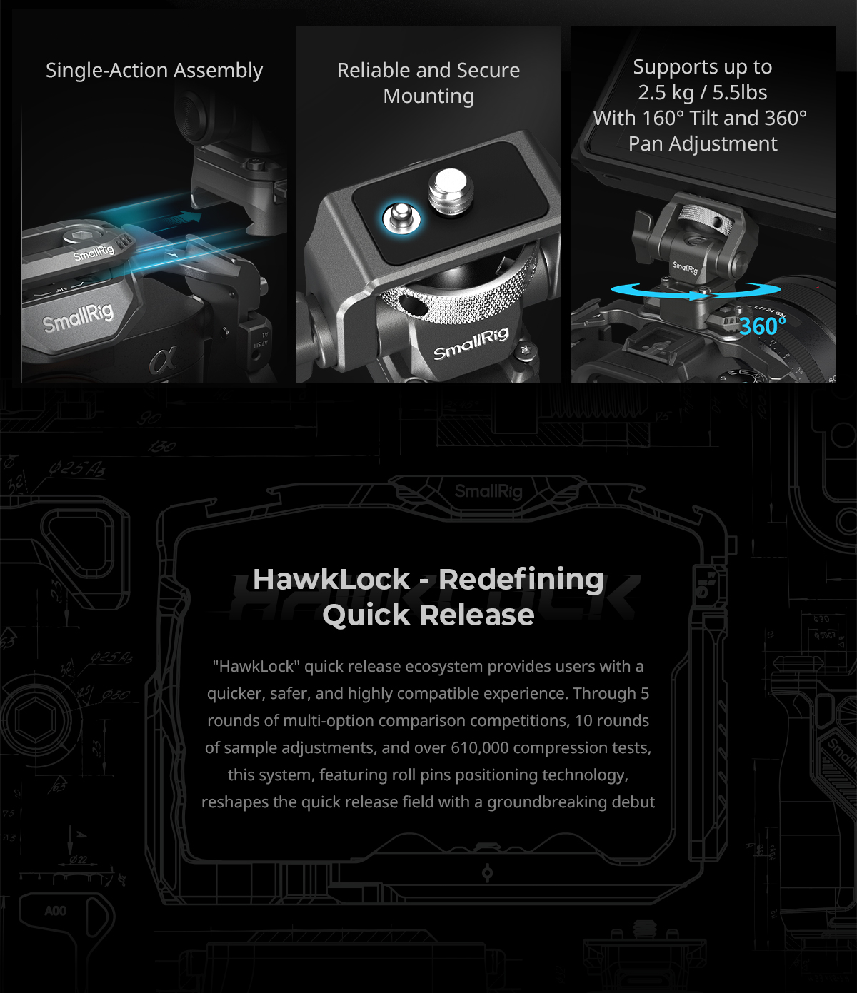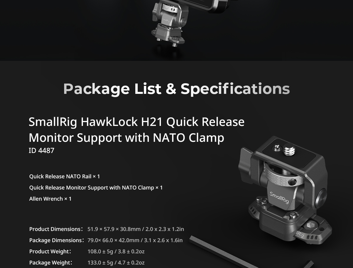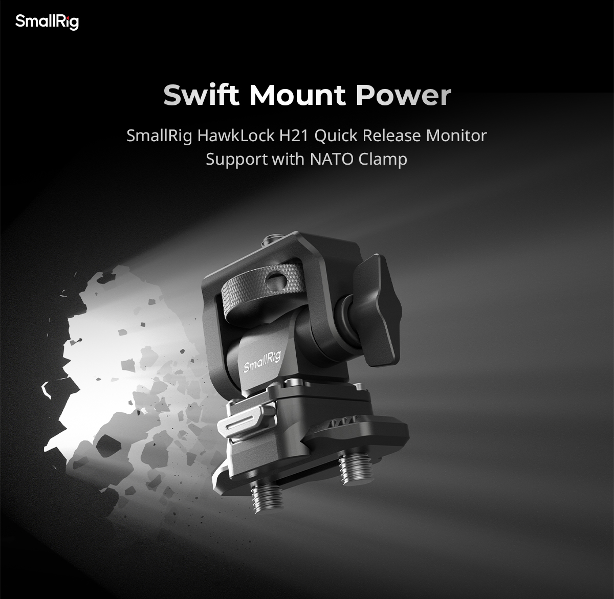SmallRig HawkLock H21 Schnellwechsel-Monitorhalterung mit NATO-Klemme 4487 besteht aus einer Schnellwechsel-Monitorhalterung mit NATO-Klemme und einer NATO-Schnellwechselschiene. Drücken Sie den Knopf, um die Stifte aufzubördeln und die NATO-Schiene in die Rille zu schieben. Lassen Sie den Knopf los, um die NATO-Schiene sicher in der Monitorhalterung zu verriegeln, was die Konstruktion stabil und den Vorgang zeitsparend macht. Die 1/4"-20-Schraube an der Oberseite kann zur Befestigung eines Monitors, Mikrofons, Lichts oder, dank des eingebauten federbelasteten Fixierstifts, eines Ninja V / Ninja V+ Monitors verwendet werden, um ein Durchbiegen zu verhindern. Der Artikel unterstützt eine Neigungsverstellung von 160°, und die Festigkeit der Neigungsachse kann über den Drehknopf schnell eingestellt werden, um sich besser an Geräte mit unterschiedlichen Gewichten anzupassen. Das Gerät kann bis zu 2,5 kg / 5,5 lb halten, und die Dämpfung liegt nach 10.000 Kippvorgängen unter 20 %, was es langlebig macht. 360° schwenkbar mit horizontaler Achsenspannung, die mit dem mitgelieferten Sechskantschlüssel eingestellt werden kann.